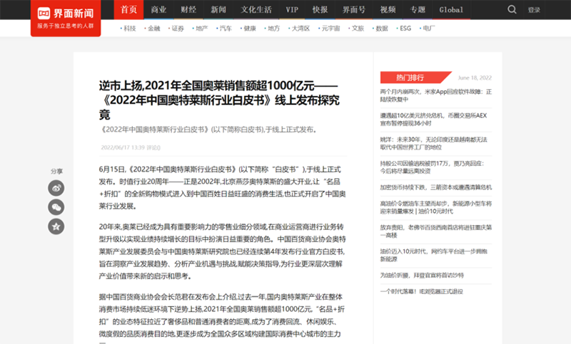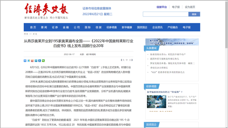 2022年6月15日,中國(guó)百貨商業(yè)協(xié)會(huì)奧特萊斯產(chǎn)業(yè)發(fā)展委員會(huì)線上直播發(fā)布《2022年中國(guó)奧特萊斯行業(yè)白皮書(shū)》。白皮書(shū)中“2021年中國(guó)零售市場(chǎng)最新發(fā)展、中國(guó)奧萊20年全覽、2021年中國(guó)奧萊市場(chǎng)發(fā)展、中國(guó)奧萊展望和政策建議、專(zhuān)家訪談”等內(nèi)容吸引政府領(lǐng)導(dǎo)、專(zhuān)業(yè)機(jī)構(gòu)、產(chǎn)業(yè)運(yùn)營(yíng)商、品牌商、服務(wù)商、媒體記者及眾多奧萊消費(fèi)者共計(jì)20余萬(wàn)人參會(huì),成為國(guó)內(nèi)奧萊行業(yè)年度一大焦點(diǎn)。