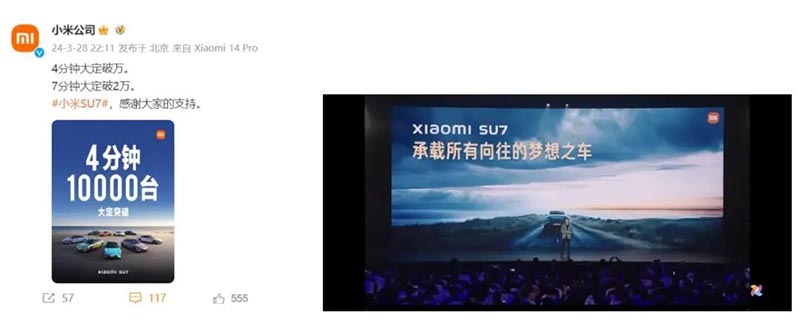 更令人矚目的是,新車(chē)在發(fā)布后僅4分鐘內(nèi)便突破萬(wàn)輛大定,7分鐘內(nèi)更是飆升至2萬(wàn),上市短短27分鐘便鎖定了5萬(wàn)臺(tái)訂單,完美詮釋了“上市即熱銷(xiāo)”的盛況,小米汽車(chē)也因此被賦予了繼特斯拉之后“新鲇魚(yú)”的稱(chēng)號(hào),SU7更是成為了2024年汽車(chē)界萬(wàn)眾矚目的焦點(diǎn)。