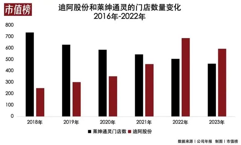 迪阿股份(股票代碼:301177),作為首飾市場(chǎng)中的一員,在“黃金熱潮”的沖擊下,已連續(xù)六個(gè)季度面臨營(yíng)業(yè)收入與凈利潤(rùn)的“雙重下滑”。2023年,其門(mén)店數(shù)量更是縮減了94家,降至594家,而萊紳通靈亦不例外,門(mén)店數(shù)量減少了44家,目前總數(shù)為463家。