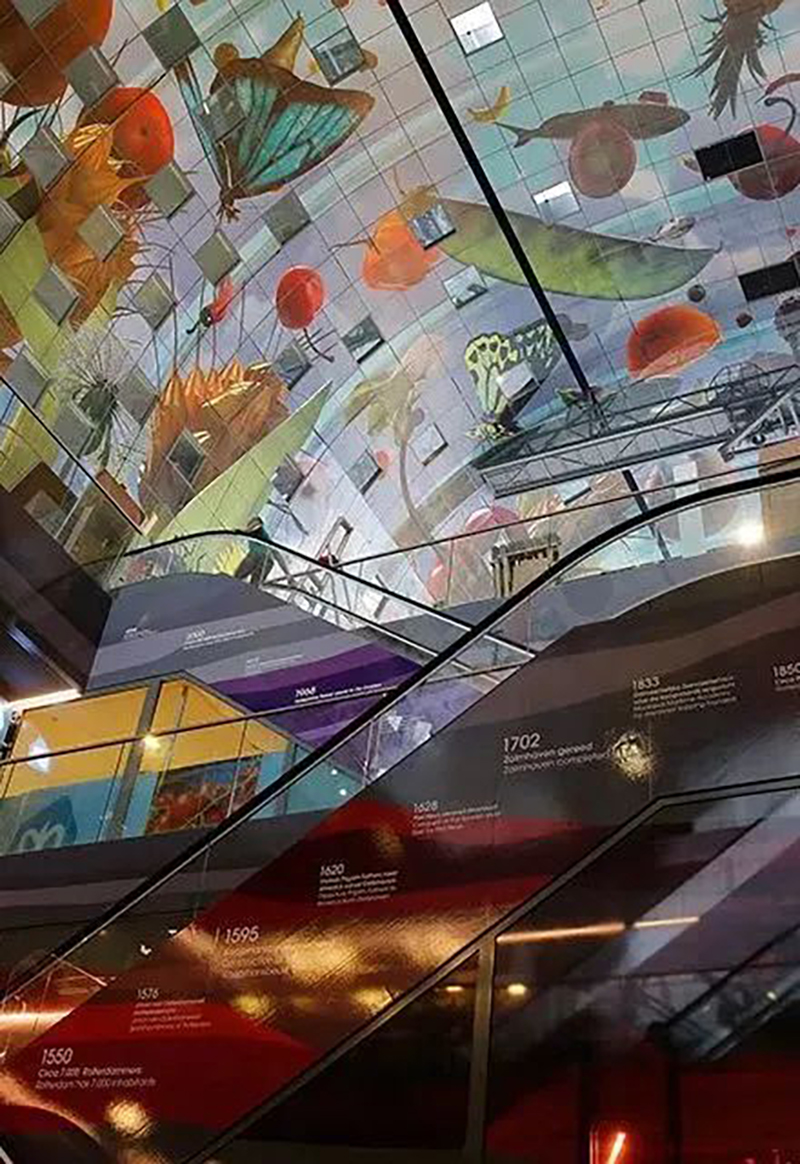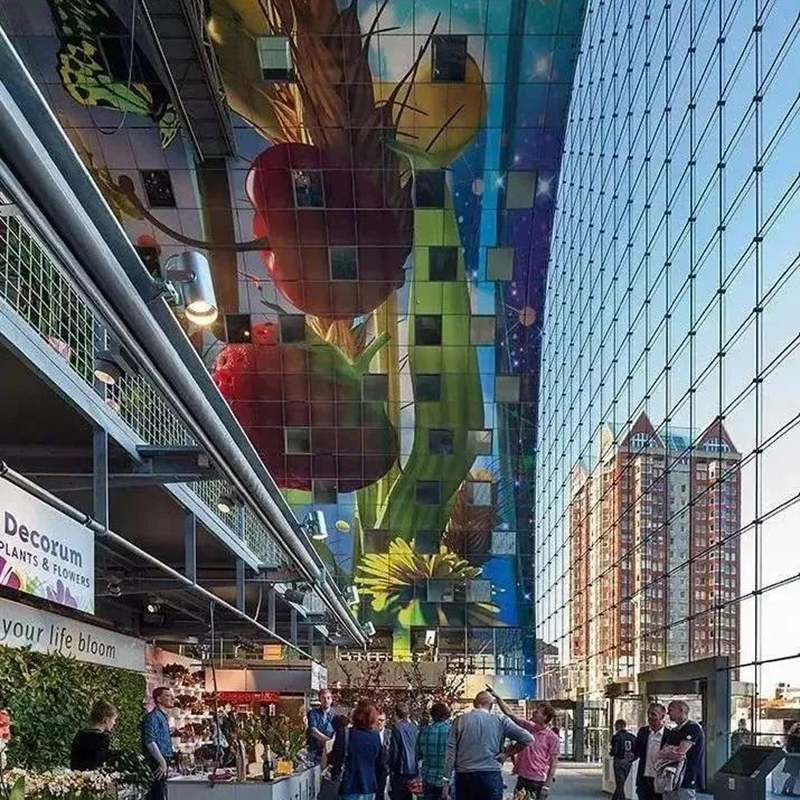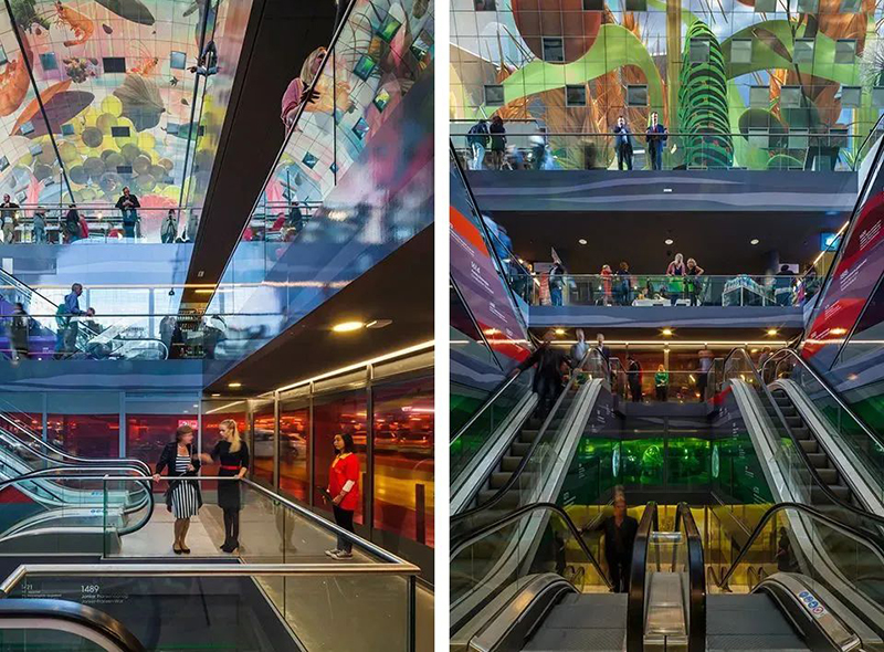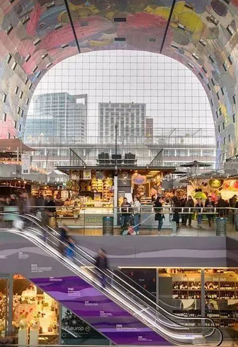 建筑弧形的內(nèi)面11000㎡的彩色藝術品“豐饒之角”,是由Arno Coenen和Iris Roskam創(chuàng)作而成,將水果、魚、面包、鮮花與附近的大教堂等元素重疊交織而成。項目除兼?zhèn)鋫鹘y(tǒng)菜市場銷售食材的功能外,消費者還能在“美食市集”享受餐飲的服務和游逛的體驗,大大滿足人們的訴求。