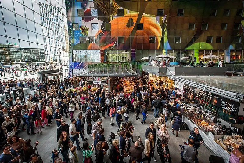 開創(chuàng)「美食市集」先河的荷蘭Markthal市場,自2014年開業(yè)以來,就受到全球各界人士的關注,年均吸引參觀游客達4.5-7百萬人次。作為荷蘭全國第一家室內(nèi)市集,以及結合居住和購物的新城市建筑類型,成功從傳統(tǒng)的菜市場轉型為具備藝術性的文藝空間、生活集市、展覽空間、創(chuàng)意工作室、綠色休閑空間以及特色居住單元空間。