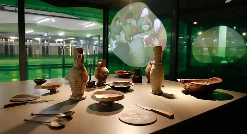 項目舊址在1940年的一次戰(zhàn)爭中歷史建筑都被摧毀,Markthal市場再建設時,地下考古團隊發(fā)現(xiàn)了各種各樣的中世紀物品。為予以紀念,便以垂直展覽的形式在市場內(nèi)的自動扶梯上展示。