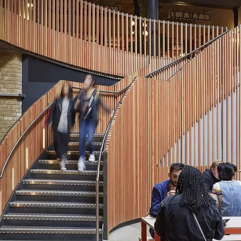 在國內(nèi),傳統(tǒng)美食廣場逐漸黯淡退場,人們更希望在美食消費場景享受到輕松愉悅的聚會和社交。MEET&EAT的創(chuàng)造團隊比褐就通過突出“MEET”的“人與人之間的社交”來塑造場景。為突出社交感,則放大公區(qū)外部的階梯座位,也使之與成都的街巷文化進行融合。