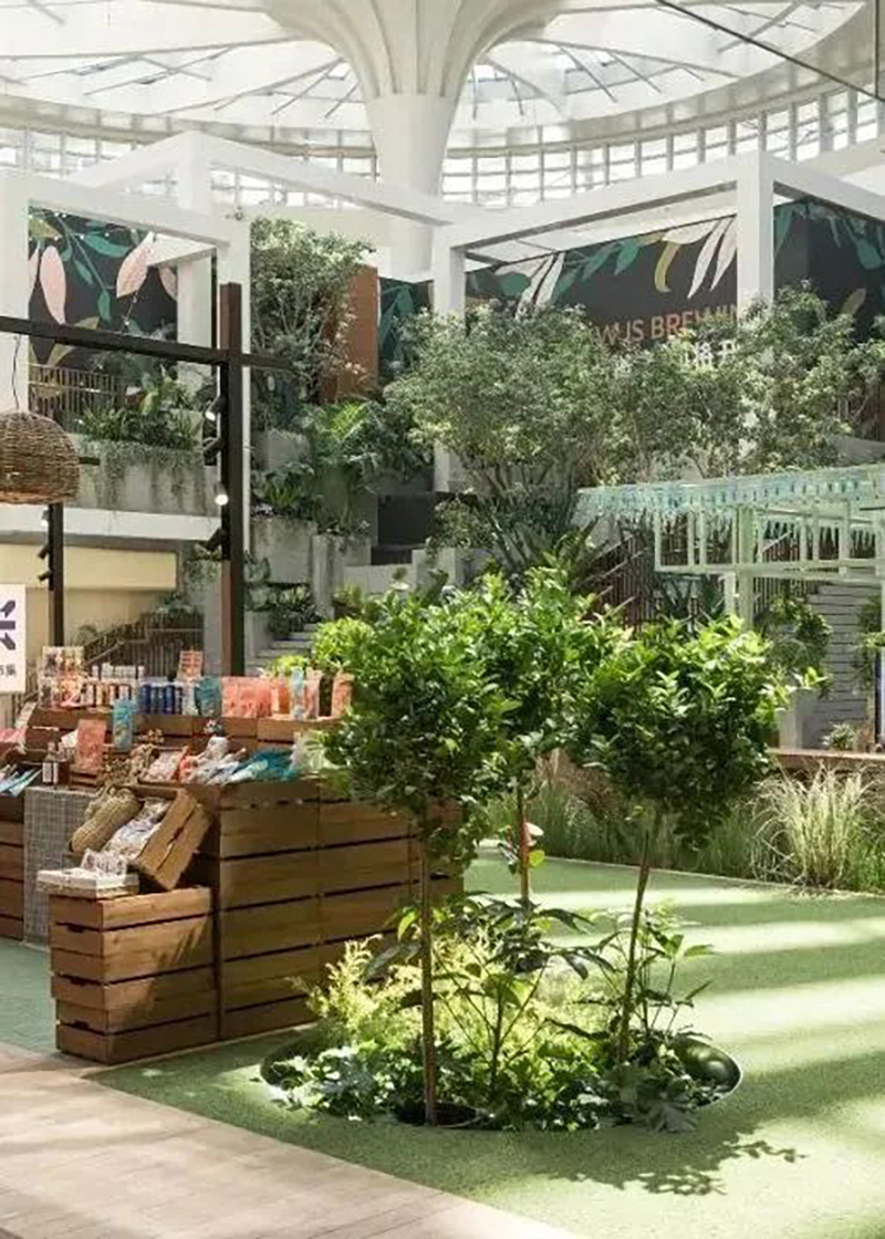 整體劃分為Foodie Market美食集市、Foodie Theatre美食劇場、Foodie Lab美食實驗室等區(qū)域。以中庭美食劇場的主題集市和舞臺為中心,創(chuàng)造田野市集,中庭兩端則分別布置棋盤廣場和陽光花房,形成多主題組團,構成活動集聚的主體空間。還通過布滿小食或營地小車的田野食街、充滿野餐氛圍的美食街市以及高低錯落的露臺食街進行空間串聯(lián),搭建整體市集氛圍。