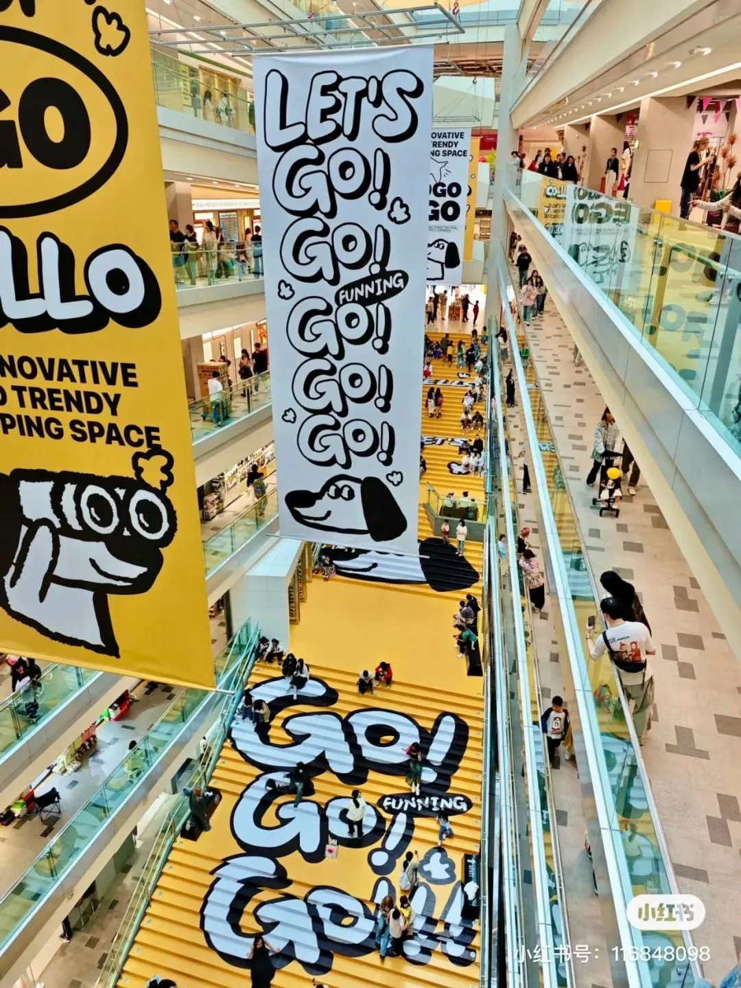 抵達(dá)商場(chǎng)入口,一抹鮮亮黃彩瞬間吸引目光;步入大堂,簡(jiǎn)潔廣告語(yǔ)映入眼簾,色調(diào)與設(shè)計(jì)渾然統(tǒng)一,主通道沐浴在明媚黃光中,配以吉祥物GoGo萌態(tài)畫像,攝影佳作信手拈來(lái),隨手一拍皆是風(fēng)景畫。