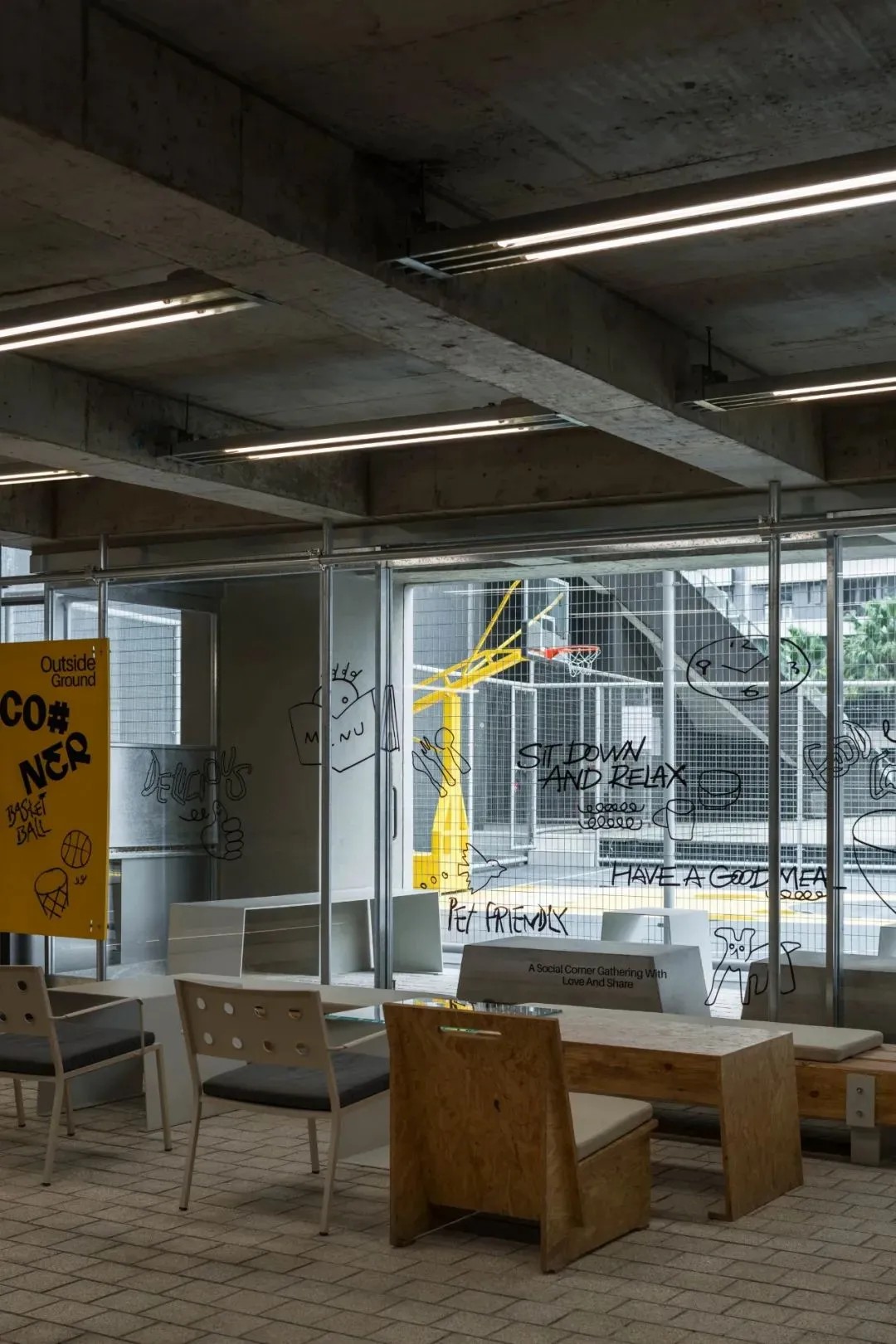 CO#NER食堂,以禁欲系冷淡風(fēng)為主旋律,設(shè)計(jì)上承襲了極致輕工業(yè)的時(shí)尚美學(xué),細(xì)膩而不失格調(diào)。其獨(dú)特的售賣模式圍繞模塊化“檔口”展開,融合POP UP快閃店概念,營(yíng)造出既持續(xù)又多變的用餐氛圍,旨在為顧客解鎖無(wú)限可能的美食探索之旅??臻g內(nèi),水泥原色與暖木色家具巧妙碰撞,輔以生動(dòng)活潑的簡(jiǎn)筆插畫,色彩斑斕間傳遞出溫馨舒適的放松信號(hào),讓人在享受美食的同時(shí),也能感受到心靈的慰藉。