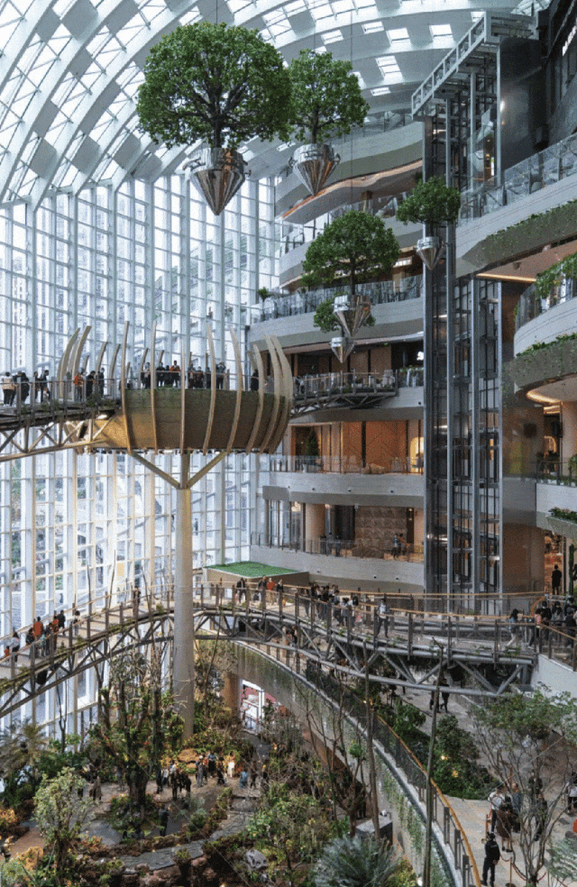 其中,「沐光森林」作為光環(huán)的標(biāo)志性景觀,以其縱跨6層、高達(dá)42米的室內(nèi)立體垂直植物園之姿,成為了眾人矚目的焦點(diǎn)。懸空其間的步行棧道,如同穿梭于綠色世界的秘徑,讓顧客在享受購物樂趣的同時,也能感受到大自然的呼吸。這條懸空跨層步道,不僅巧妙地連接了商業(yè)區(qū)域與森林景觀,更讓每一次購物之旅都充滿了探索自然與發(fā)現(xiàn)驚喜的奇妙體驗(yàn)。