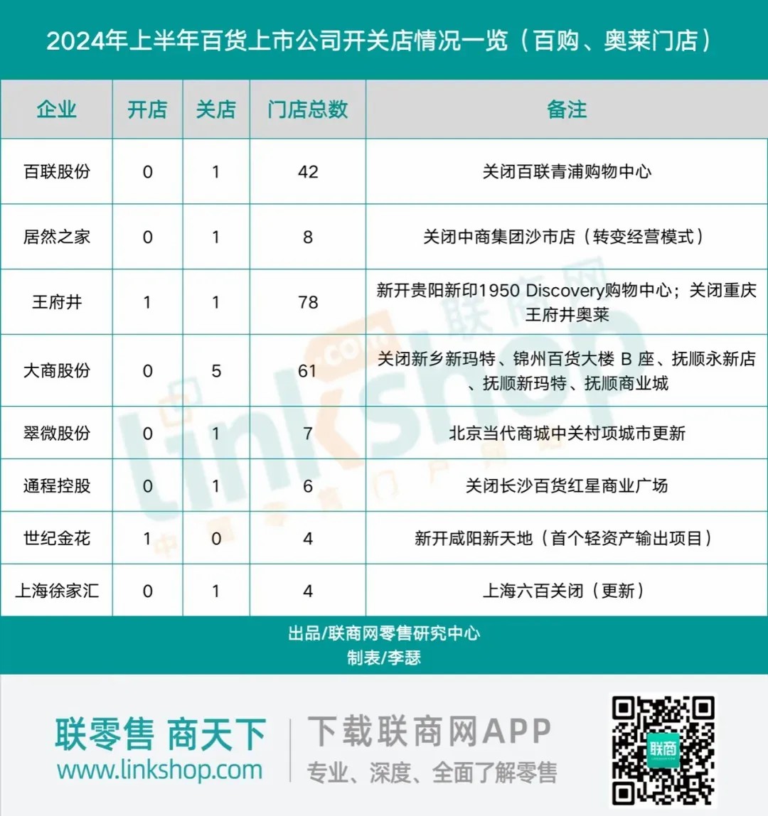 在門店的開設(shè)與關(guān)閉動態(tài)上,2024年上半年呈現(xiàn)出一個顯著的趨勢:關(guān)店數(shù)量遠(yuǎn)超開店數(shù)量。具體而言,44家百貨上市公司在此期間僅新增了2家門店(此數(shù)據(jù)僅限于百貨商店、購物中心及奧特萊斯門店),而關(guān)閉的門店數(shù)量則達到了11家。與之形成對比的是,去年同期這些公司開關(guān)店的數(shù)量均為5家。這一變化表明,與去年相比,百貨上市公司在開設(shè)新店方面變得更加謹(jǐn)慎,而關(guān)閉門店的速度卻在加快。