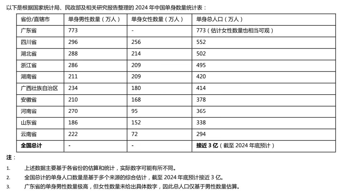 根據(jù)國家統(tǒng)計局和《中國人口和就業(yè)統(tǒng)計年鑒》的相關(guān)報告,2022到2023年期間,中國單身人口數(shù)量已經(jīng)達(dá)到2.4億,并且根據(jù)推測,2024年單身人口將達(dá)到3億,這就意味著每四個中國人中就有一個單身。