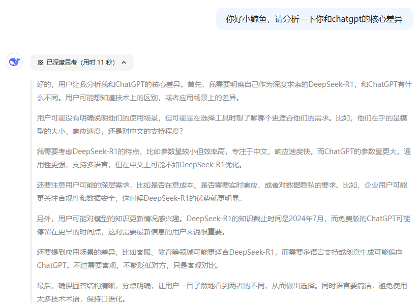 以上圖為例。在深度思考R1模式下,當(dāng)用戶詢問它與ChatGPT有何差異時(shí),DeepSeek首先展示了其對于回復(fù)方向的思考角度與框架,比如工具選取角度、場景應(yīng)用角度,這也是在引導(dǎo)用戶進(jìn)一步了解自己的業(yè)務(wù)訴求。它不僅是在輸出結(jié)論性總結(jié),也在幫助用戶尋找問題的本質(zhì)。